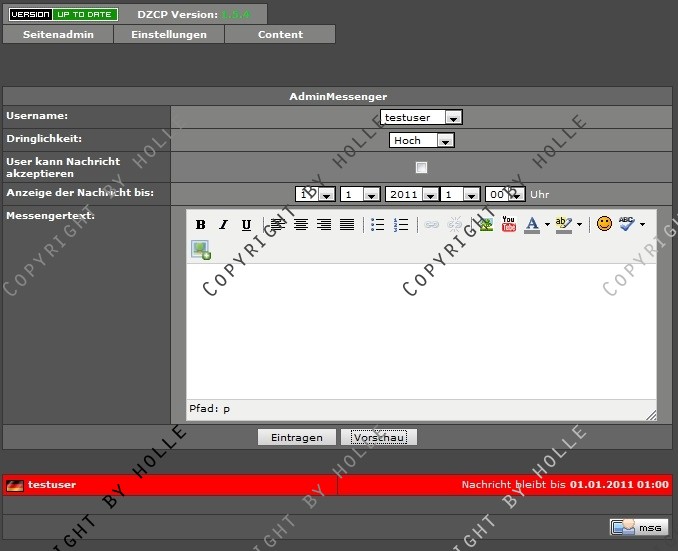 Nachdem mich einer meiner Mitadmins auf die Idee gebracht hat, ein Nachrichtensystem zu bauen, was einem Admin gestattet, einen User direkt anzuschreiben und eine Nachricht für längere Zeit bei ihm als Info anzeigen zu lassen, habe ich mich drangesetzt und ein neues Addon gecodet.
