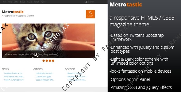 Metrotastic is a responsive HTML5 / CSS3 Theme for WordPress. It is based on Twitter’s Bootstrap Framework – Enhanced with jQuery and custom post types. It’s designed with online magazines in mind and comes with a light and dark color scheme and unlimited color options. It looks fantastic on mobile devices, is easy to setup and has some amazing CSS3 and jQuery effects. Everything right out of the box. So what are you waiting for?